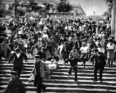 However, Eisenstein’s career as a whole is a sad story. He was born in Riga in 1898. He was an engineer by training, migrated to set design and theatre before moving quickly into film. Absolutely congruent with his bursting film energies was his fervor for the communist revolution and the establishment of the Soviet state. To think of him as a director who just happened to be Russian or who was subservient to a state-controlled industry and managed to get some good art into his films despite is subservience, is to miss the core of Eisenstein. His early works were exponents of his beliefs.