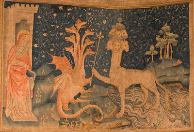 A seven headed beast appears in a detail from the Angers Apocalypse tapestry . Illustrating scenes from the Book of Revelation, these works were begun in 1376 for Louis, Duke of Anjou.