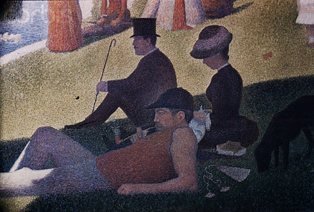 Georges Seurat's frustration with the limitations of Impressionism, particularly its lack of accurate line and detail, drove him to develop the technique of Pointillism or as it was otherwise called, Neo-Impressionism. This was a more scientific approach to the mixture of color which was applied in small dots of paint that blended optically when viewed from a distance..The monumental trio in the foreground of Seurat's La Grande Jatte, might be seen as a symbol of modern man's isolation amid his own kind. .."