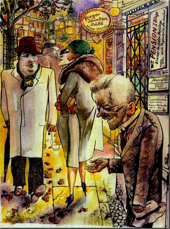 Kuspit: However different the societies they picture, both Dix and Toulouse-Lautrec show us a society in which the proletariat underclass serves the bourgeois upperclass. In Dix, the poor proletariat serves in the military -- as he did as a machine-gunner in World War I -- that supports the wealthy bourgeois, among them the fat cats pictured in the central panel of his masterpiece Grossstadt (1927-28) image: http://strawberige.blogspot.com/2010_06_01_archive.html
