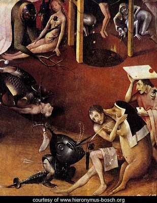 "Somewhat ironically, lust was also known as 'music of the flesh'. Therefore the musical instruments here suggest that the victims are paying for their lust in their previous life. Bosch is also implying that things that cause people pleasure in life, like musical instruments, can and will cause them pain later on.The people are not paying only for their lustfulness but also for all manner of sins: idleness is illustrated by the man in his bed being looked upon by demons." ...Read More: http://theartdaily.blogspot.com/2010/03/hieronymus-bosch-garden-of-earthly_22.html